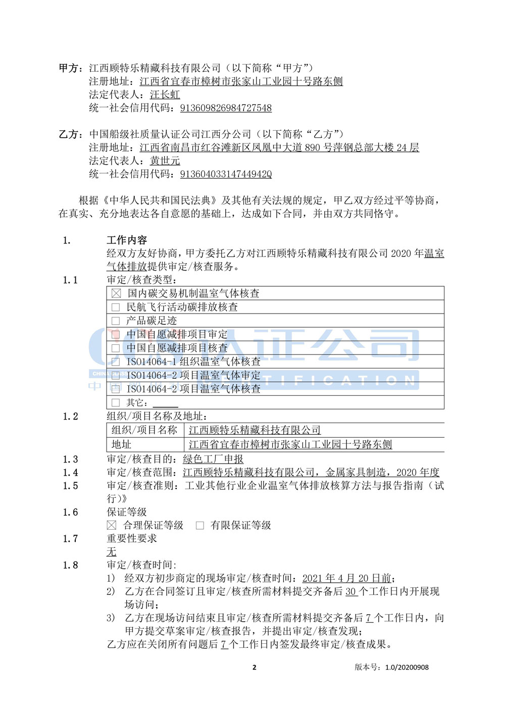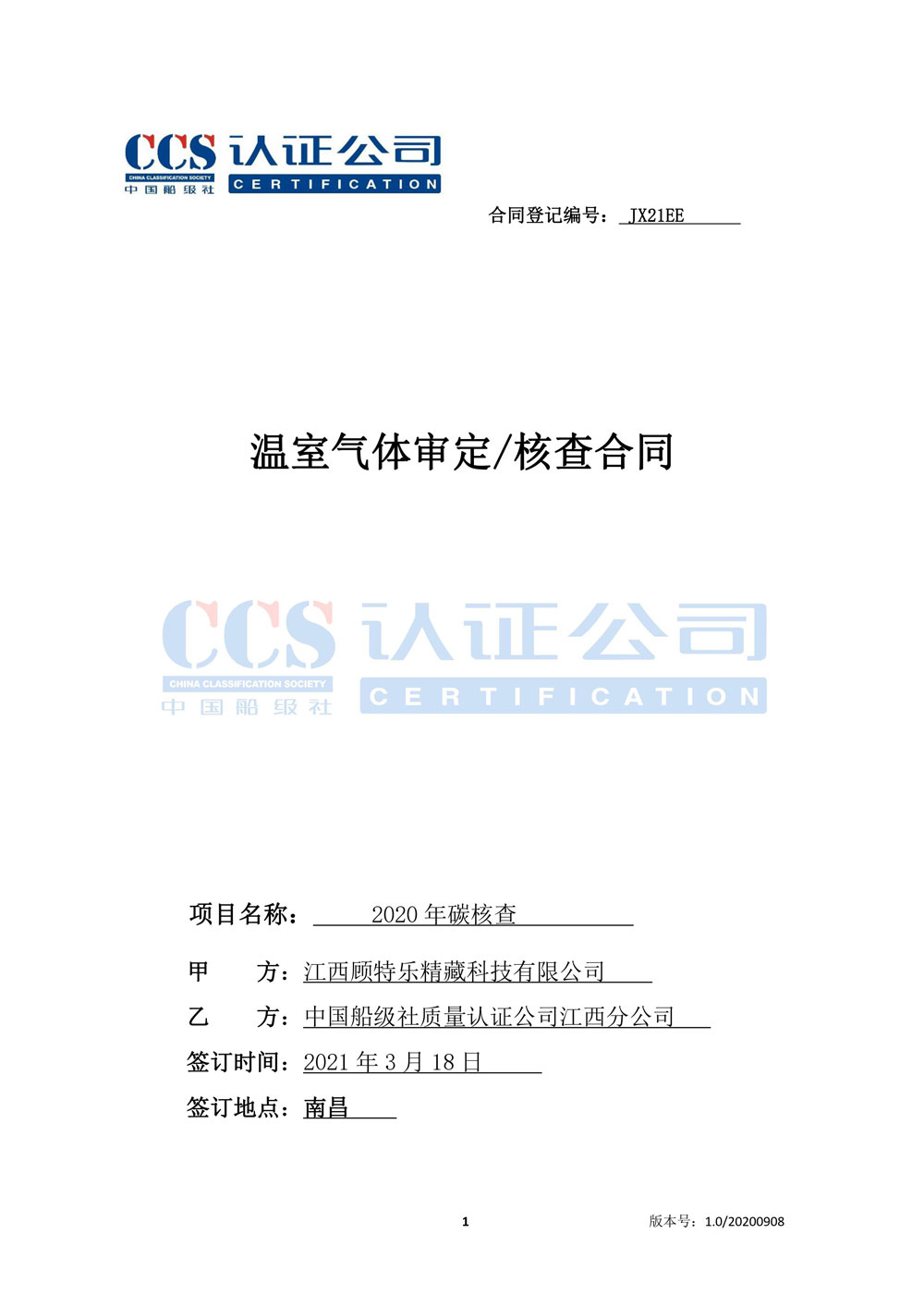 江西顧特樂溫室氣體審定核查合同