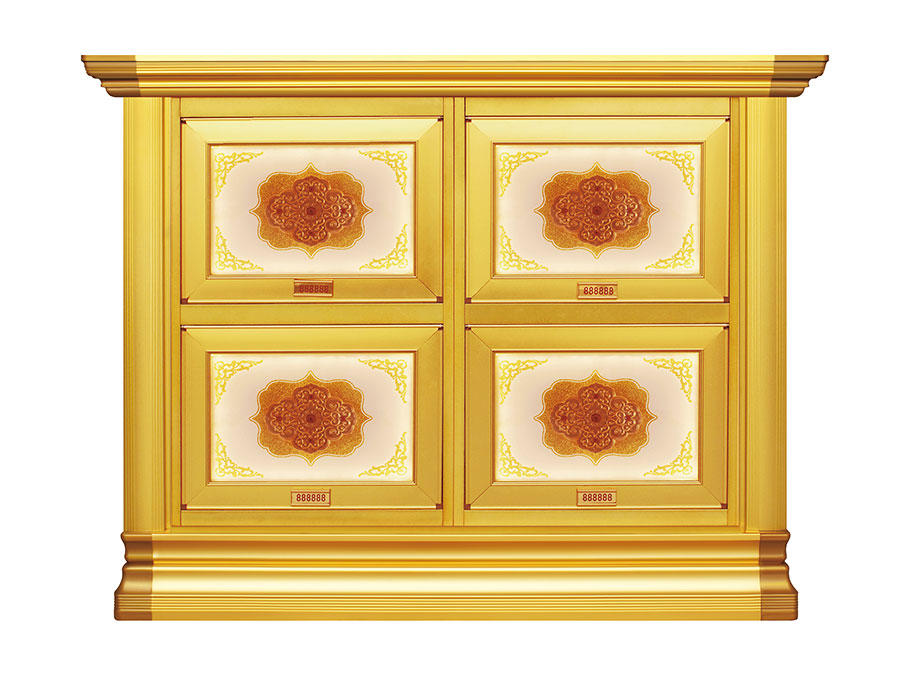 骨灰存放架是由箱體、面板、側(cè)板、頂蓋、底座、轉(zhuǎn)角、封板等構(gòu)成,以及佛臺、掛落、佛 龕等相關(guān)配件構(gòu)成。 箱體:分鍍鋅板、不銹鋼板、鋁板等五金板材箱體,鋁合金中空板扣接式箱體和純鋁壓鑄型 箱體。 面板:面板根據(jù)工藝不同、材料不同,風(fēng)格各異、大不相同,既要起到美觀易分類作用,又 要起到防火、防塵、防潮、防蟲等作用。 側(cè)板:用于裝飾和保護(hù)箱體側(cè)面的作用,又可根據(jù)現(xiàn)場,對存放架分類的標(biāo)識作用,一目了 然方便管理。 頂蓋、底座:都是穩(wěn)固整列和整排箱體水平線,底座還起到一部分承重作用。 轉(zhuǎn)角、封板:箱體轉(zhuǎn)彎處和空隙處塑形的作用。 佛臺:由幾個骨灰存放架組成一個小型佛龕臺,用于放置佛像。 佛龕、掛落:整排存放架為了劃分區(qū)域,在每個區(qū)域靠墻上方,設(shè)置小型佛龕,為了美觀, 加上掛落。