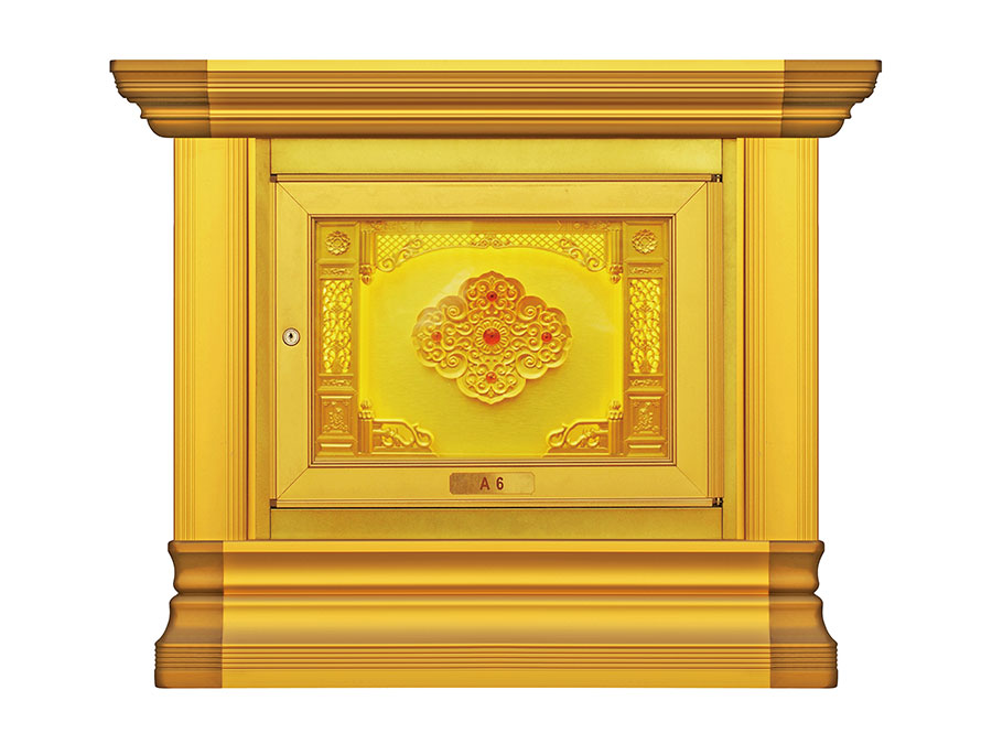 骨灰存放架是由箱體、面板、側板、頂蓋、底座、轉角、封板等構成,以及佛臺、掛落、佛 龕等相關配件構成。 箱體:分鍍鋅板、不銹鋼板、鋁板等五金板材箱體,鋁合金中空板扣接式箱體和純鋁壓鑄型 箱體。 面板:面板根據(jù)工藝不同、材料不同,風格各異、大不相同,既要起到美觀易分類作用,又 要起到防火、防塵、防潮、防蟲等作用。 側板:用于裝飾和保護箱體側面的作用,又可根據(jù)現(xiàn)場,對存放架分類的標識作用,一目了 然方便管理。 頂蓋、底座:都是穩(wěn)固整列和整排箱體水平線,底座還起到一部分承重作用。 轉角、封板:箱體轉彎處和空隙處塑形的作用。 佛臺:由幾個骨灰存放架組成一個小型佛龕臺,用于放置佛像。 佛龕、掛落:整排存放架為了劃分區(qū)域,在每個區(qū)域靠墻上方,設置小型佛龕,為了美觀, 加上掛落。