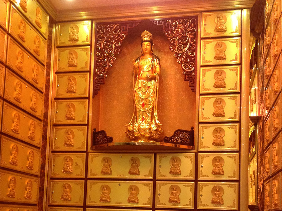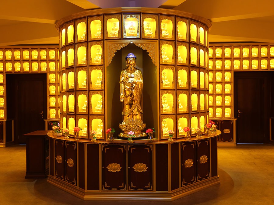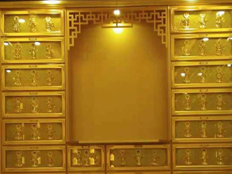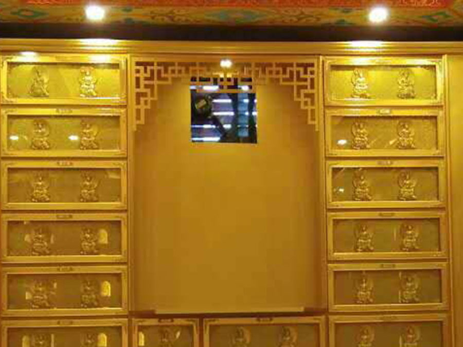 整排存放架為了劃分區(qū)域,在每個(gè)區(qū)域靠墻上方,設(shè)置小型佛龕,為了美觀,加上掛落。