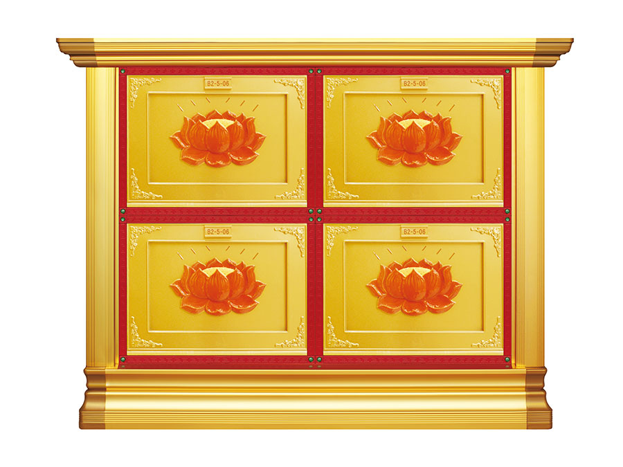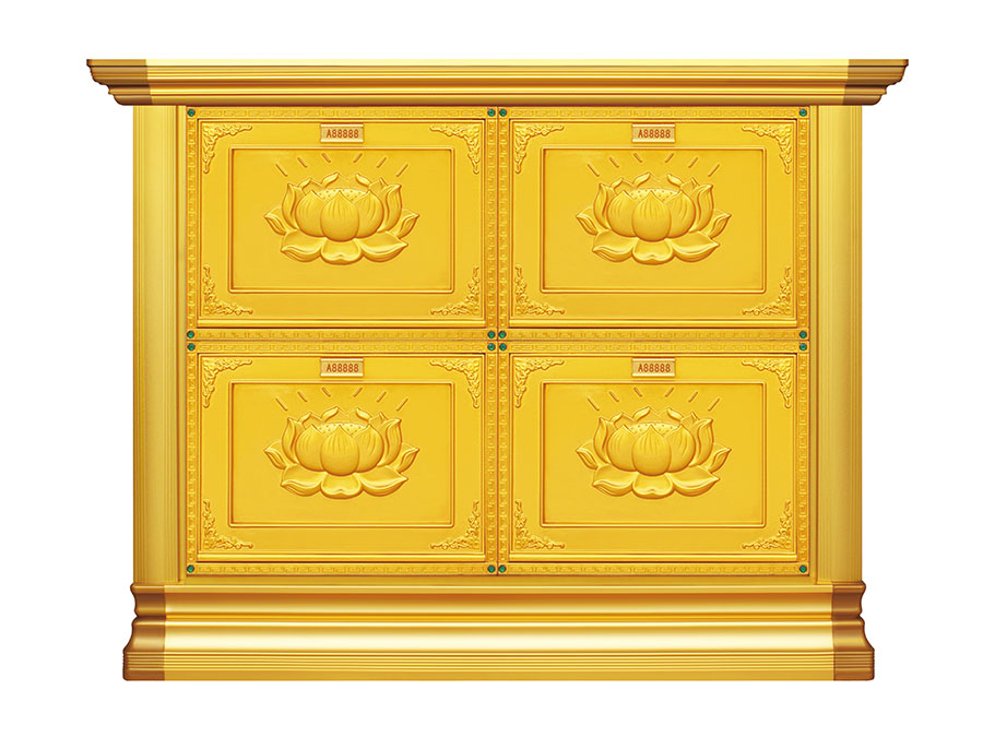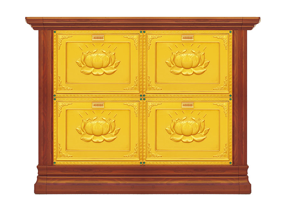 骨灰存放架是由箱體、面板、側板、頂蓋、底座、轉角、封板等構成,以及佛臺、掛落、佛 龕等相關配件構成。 箱體:分鍍鋅板、不銹鋼板、鋁板等五金板材箱體,鋁合金中空板扣接式箱體和純鋁壓鑄型 箱體。 面板:面板根據工藝不同、材料不同,風格各異、大不相同,既要起到美觀易分類作用,又 要起到防火、防塵、防潮、防蟲等作用。 側板:用于裝飾和保護箱體側面的作用,又可根據現場,對存放架分類的標識作用,一目了 然方便管理。 頂蓋、底座:都是穩(wěn)固整列和整排箱體水平線,底座還起到一部分承重作用。 轉角、封板:箱體轉彎處和空隙處塑形的作用。 佛臺:由幾個骨灰存放架組成一個小型佛龕臺,用于放置佛像。 佛龕、掛落:整排存放架為了劃分區(qū)域,在每個區(qū)域靠墻上方,設置小型佛龕,為了美觀, 加上掛落。